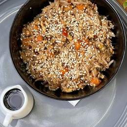 Японський суп з морепродуктами, гречаною локшиною, водоростями вакамé та норі, з овочами, кунжутом і соєвим соусом