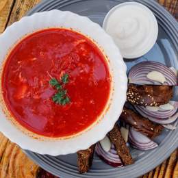 Домашній борщ на курячому бульйоні подається з салом, червоною цибулею, часником, сметаною та житнім хлібом
