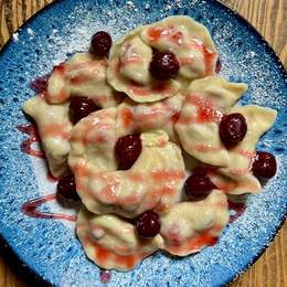 Вареники з вишнею, посипані цукровою пудрою та свіжою вишнею