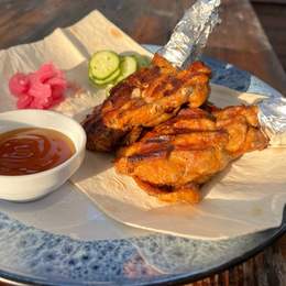 Свинячі ребра на грилі, з солоним огірком, маринованою червоною цибулею, зеленню та соусом барбекю
