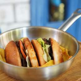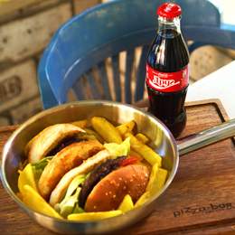 Соковита котлета з мармурового м’яса, солодкий цибулевий джем, томати, солоний огірок, сирний соус та картопля.Coca-Cola 0.25