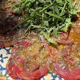 Слайси маринованої вирізки з телятини,гірчично бальзамічна заправка,рукола,пармезан.