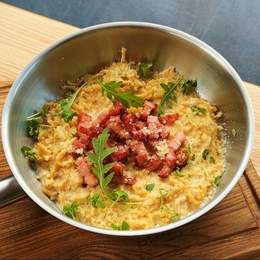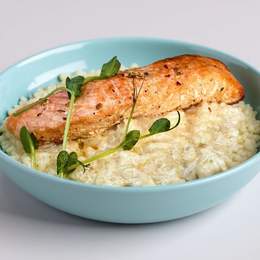 Вишукана та елегантна страва, яка припаде до смаку любителям морепродуктів та італійської кухні. Поєднання ніжної риби та кремового різотто створює незабутні смакові відчуття