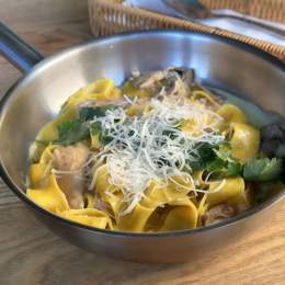 Ніжна домашня паста поєднується із соковитими шматочками кролика та ароматними грибами у вершковому соусі. Страва має багатий смак і стане чудовим вибором для любителів італійської кухні