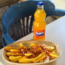 Картопляні діпи, обсмажені до золотистої скоринки, посипані хрустким беконом.Fanta 0.25