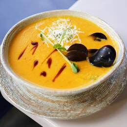 Ніжний крем суп з гарбуза та селери,падається з мідіями та сиром дор блю.
