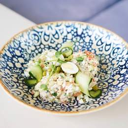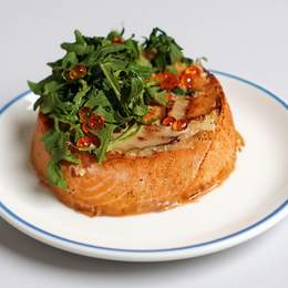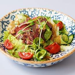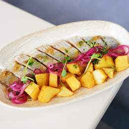 Витончена страва, де ніжний свіжий лосось гармонійно поєднується з солодкою соковитістю стиглого манго та ніжною кремовістю авокадо. Делікатний смак підкреслює марсельська нотка червоної цибулі, а поєднання оливкової та кунжутної олії разом із вишуканим соусом понзу надає страві глибини та аромату. Свіжість доповнює долька лимона, хрумкість — тонкі чипси з пармезану
