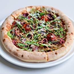 Неаполітанська піца, яка складається з тонкого, хрумкого на скоринці тіста, фірмового соусу, а також телятини,руколи,помідору запечений у пряній олії та пармеджано ріджано