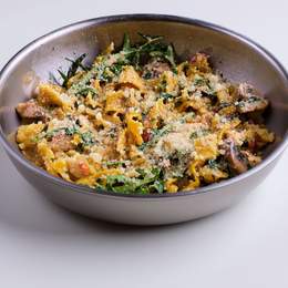 Вишукана комбінація білих грибів, креветок і кальмарів у ніжному вершковому соусі з додаванням бренді та пряних трав. Подається з широкою пастою фітучіні та пармезаном.