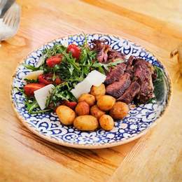 Ароматне поєднання ніжних шматочків свинини, обсмаженої картоплі та свіжих грибів із беконом. Гармонія смаків доповнюється зеленню та соковитими помідорами