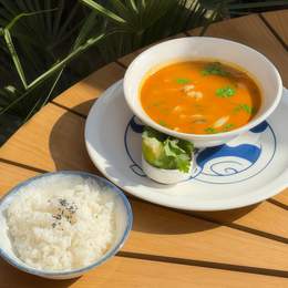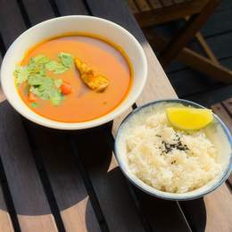 Гостро-пряний рибний бульйон на кокосовому молоці з морепродуктами, грибами та томатами, подається з рисом