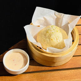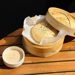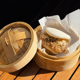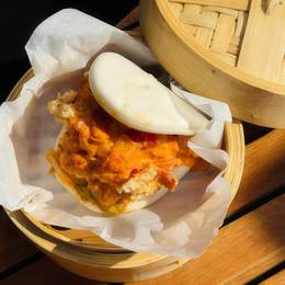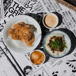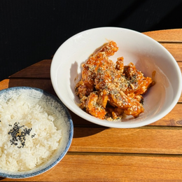 Паровий рис із соусом ХО, який готується з морепродуктів та бекону, маринований дайкон, капустам кімчі, арахісовий майонез та зелена цибуля
