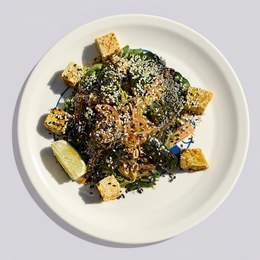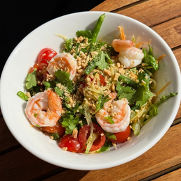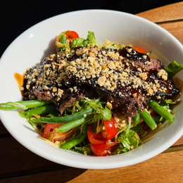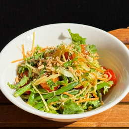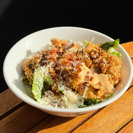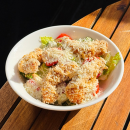Салат ромен, томати чері, соус на основі анчоусів і пікантного кочуджан, куряче стегно обсмажена в японських сухарях, пармезан, кранч з бекону та гарлік оіл