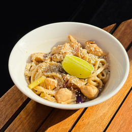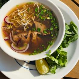 Бульйон з яловичини, рисова локшина, маринована вирізка з телятини
