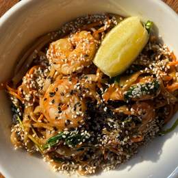 Паровий рис, соус ХО, який готується з морепродуктів та бекону, майонез кимчі, мариновані морква, червона редька та яйце