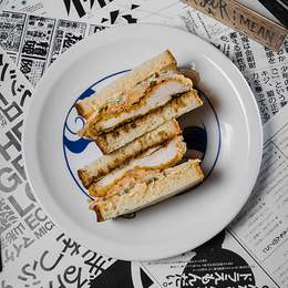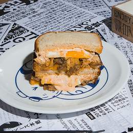 Японський сендвіч із молочним хлібом, із соусом барбекю із чорного часнику, майонезом кімчі, капустою кімчі та яйцем