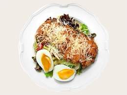 Не той самий, а наш, тому й з хрустким зовні, але ніжним всередині шніцелем. З додаванням зелені, томатів, яйця, пармезану і заправки як треба.
