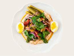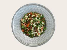 Близькосхідний салат зі свіжої зелені, огірків, помідорів та відварного птітіму. Заправлений оливковою олією з лимонним фрешем і сіллю