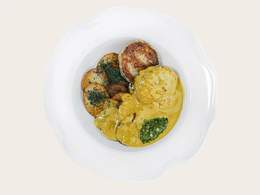 Котлети зі щуки й судака ранкового улову. До них елегантно вписується смажена, але попередньо відварена молода картопля. Доповнює композицію вершково-гірчичний соус.