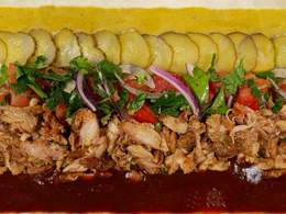 Піта змащується хумусом, тхіною, амбою та схугом. Всередині - солоний огірок, салат зі свіжих овочів і шварма із курки. Це все поливаємо тхіною з амбою