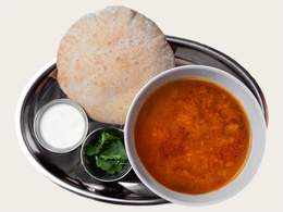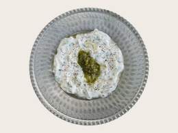 Грецький соус з йогурту, свіжих огірків, часнику, спецій та солоного лимона. Подаємо зі схугом і сумахом.