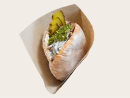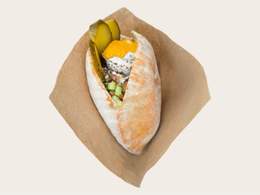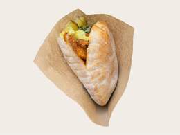 Всередині піти філе окуня в паніровці зі спеціями, кунжутний соус, айсберг, томати, огірки та соус з вареного яйця, сметани, майонезу, солоних огірків, каперсів, петрушки, часнику, ворчестеру та гірчиці.