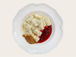 Ліниві вареники з малиновим джемом та заварним кремом (300g)