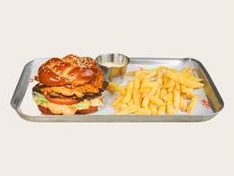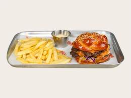 Хала булочка, подвійна яловича котлета, чеддер, солоний огірок, чилі, червону капусту, соус тхіна-айолі. До порції - фрі й сирний соус