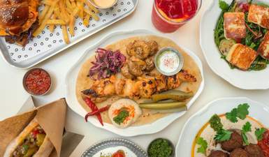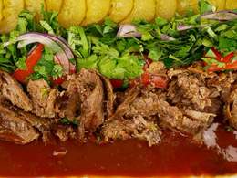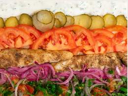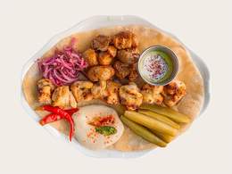 М‘ясце щойно з мангалу. Маринуємо в кефірі з часником та спеціями. Смажимо-вертимо й подаємо на нашому коржику з печеною картоплею, солоним огірком, гострим перцем і маринованою цибулею. Із соусів — хумус, гострий схуг та грецький йогурт.