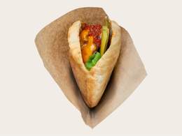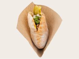 Близький родич шаурми. В коржик загортаюсть фалафель, мікс салату, солоний огірок, тхіну й томатний соус. До порції - фрі та сирний соус