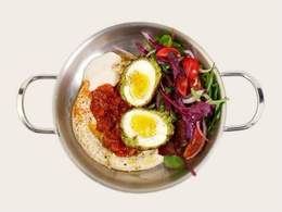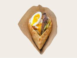 Свіжа бринза, варене мариноване яйце, пухка узбецька булочка, ніжний шпинат, свіжі томати та огірок, заправлені оливковою олією. А також пастрамі з індички (філе індички, тим’ян, часник, сіль, перець, вершкове масло).