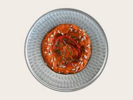 Закуска із печених перців, горіхів і спецій. Подаємо з насінням соняшника, базиліком й оливковою олією.