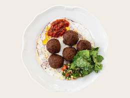 В одній тарільцяті тебе зустрічають такі народні зірки близького сходу, як: хумус, соус шакшука, фалафель з яйцем чи яйце з фалафелем, тхіна. Для підбадьорення — свіжий салат із чері та синьої цибулі. *шалені оплески*