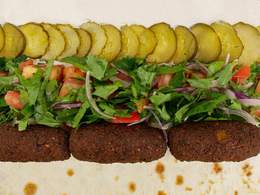 Піта змащується хумусом і тхіною. Далі йде амба та схуг, солоний огірок, овочевий салат, фалафель