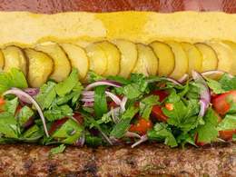 Всередині піти баранячий кебаб порізаний слайсами із прянощами та сметаною, зелена цибуля, лимонно-йогуртовий соус з часником, соус мухаммара, хрумкий картопляний дерун із моцарелою та свіжі томати