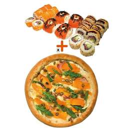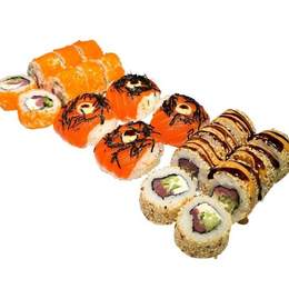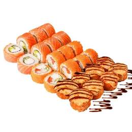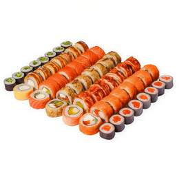 Макі з огірком, рол Боніто з лососем спайсі, рол Філадельфія з лососем, Рол Сирний, Гриль-рол з лососем, Каліфорнія з лососем та крабом, Макі з лососем. Порція 56 шт.