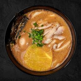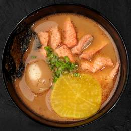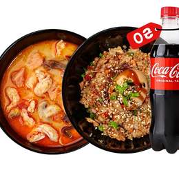 Бульон на основі кокосового молока, пасти том ям та рибного соусу, сік лайму, цукор, сіль, удон, лосось, креветка, помідор, гриби печериці, гриби шиїтаке.