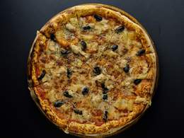 Тісто, томатний соус, моцарела, філе куряче, ананас, маслини, пармезан, трави