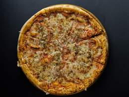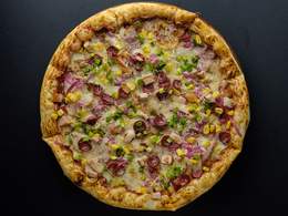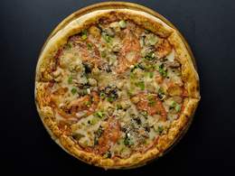 Тісто, томатний соус, салямі, мисливські ковбаски, філе куряче, помідор, моцарела, цибуля маринована, пармезан, трави