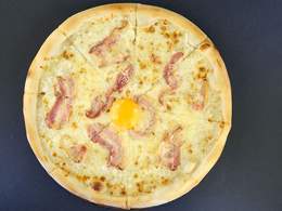 Тісто, вершковий соус, моцарела, бекон, яйце, пармезан, трави