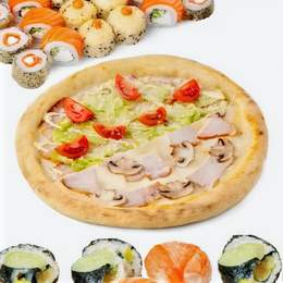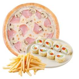 Склад: Піца Курча Песто, Рол Каліфорнія з лососем, Картопля Фрі Вага: 845 г.