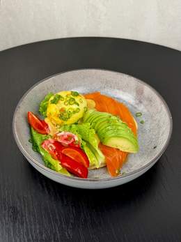 Ніжний, великий та пухкий домашній оладик зі слабосоленим лососем, авокадо, томатами черрі, салатом ромен, яйцем пашот та голандським соусом.