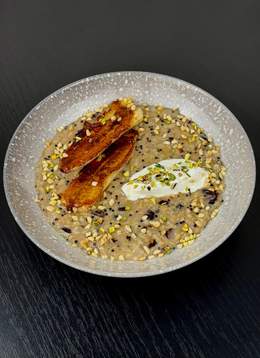Солодка вівсяна каша з кіноа на банановому молоці, з сушеною журавлиною та банановим кремом. Зверху страву прикрашає карамелізований банан, крем сир, горішки фісташки та арахісу.