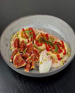 Ніжні сирники зі слайсами інжиру на подушці з бананового крему. Кислинкою доповнює малинове конфі та крем сир. Зверху посипаємо горішками фісташки.
