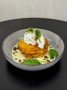 Гарбузові оладки з копченим лососем, яйцем пашот, вершковим соусом та крем сиром. Зверху посипаємо карамелізованим насінням гарбуза та зеленою цибулею.