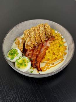 Тільки уяви, великий, пишний та смачний оладик як вдома. Не панкейк, а саме оладик. Його доповнює соковита курка кацу, смажений бекон, яйце та кукурудза. В основі вершковий соус, а зверху додаємо трохи спайсі соусу для пікантності.