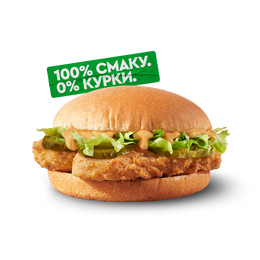 Вегетаріанська страва. До складу входять інгредієнти з молока та яєць. Гладка булочка, свіжий салат, мариновані огірки та два золотисті веджі-стріпсі з ніжним соусом.