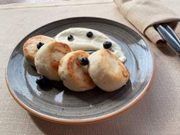 Сирники з фермерського сиру, подаються з ізюмом, білим шоколадом, горіховою крихтою та лохиною