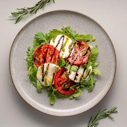150/40г Помідор, сир Моцарелла, соус Песто, мікс салату (рукола, мангольд, шпинат, лоло біонда, лоло россо), бальзамічний крем.100г:345 Ккал/Ж32/В5/Б7