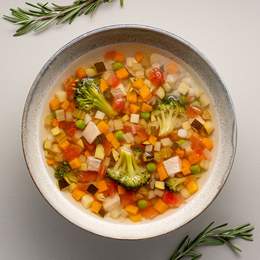 320г Бульйон курячий, овочі (картопля, помідор, селера, морква, броколлі, кабачок, горошок, цибуля ріпчаста, масло вершкове, часник, чебрець), куряче філе су-від, петрушка.100г:49 Ккал/Ж2,8/В3,1/Б3,5